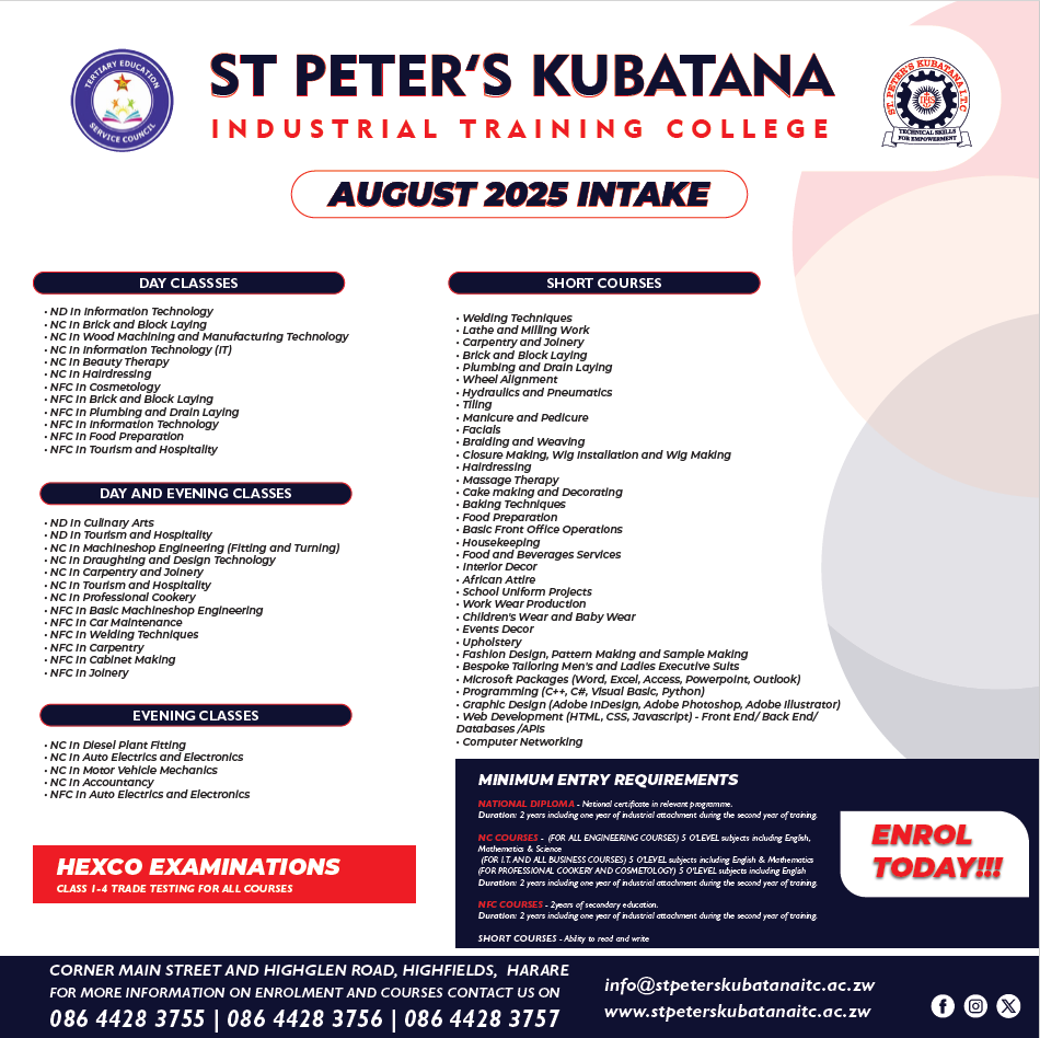 Don't just dream about your future, build it! Registration is now officially open for the upcoming intake at St Peter's Kubatana Industrial Training College. This is your chance to join a vibrant community dedicated to academic excellence, innovative learning, and unparalleled student support. Whether you're looking to kickstart a new career, advance in your current field, or explore new passions, our diverse programs and experienced faculty are here to guide you every step of the way. Don't miss out on the opportunity to transform your aspirations into achievements. Register today and secure your spot!